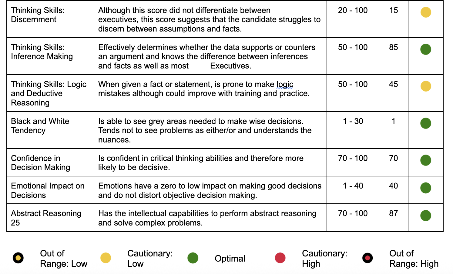 Similar to Optimal Scores, scorecards show factors, descriptions of the user, ideal ranges, user scores, and an indicator showing fit.